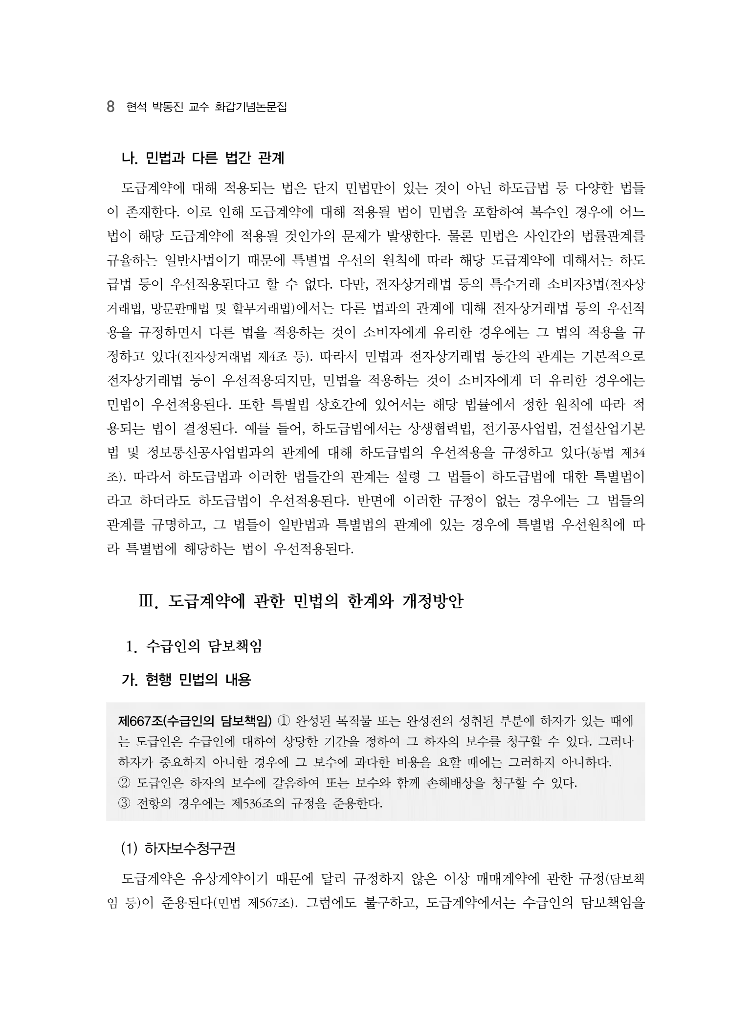 이번 논문집에는 진심 어린 축하와 존경을 담아 동료와 후학들께서 헌정하신 38편의 귀중한 논문을 수록하였습니다. 민법 전 분야에 이르는 중요한 법리를 분석한 논문, 중요 판례를 평석한 논문, 민법 개정 방향을 제시한 논문까지 다양합니다. 특히 교수님의 학문적 연구에 지대한 영향을 받아 작성된 후학들의 글은 교수님의 헌신에 힘입은 결과이며 계속 후학들의 연구에 빛을 비춰줄 것입니다.