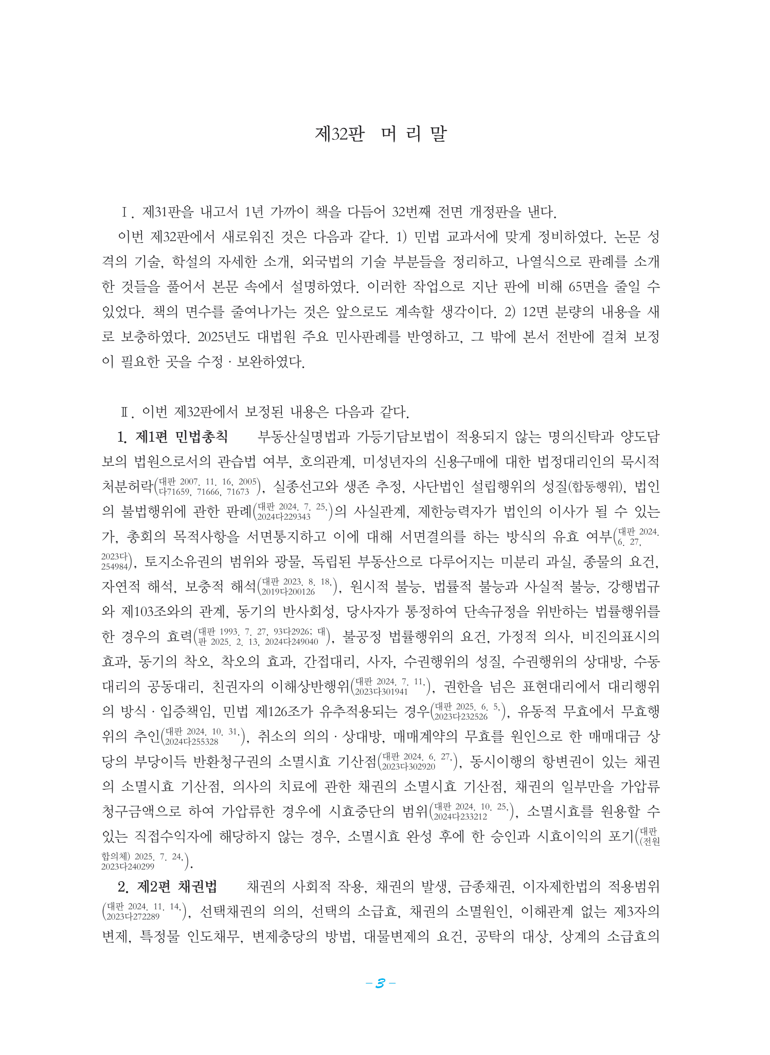 이번 제32판에서 새로워진 것은 다음과 같다. 1) 민법 교과서에 맞게 정비하였다. 논문 성격의 기술, 학설의 자세한 소개, 외국법의 기술 부분들을 정리하고, 나열식으로 판례를 소개한 것들을 풀어서 본문 속에서 설명하였다. 이러한 작업으로 지난 판에 비해 65면을 줄일 수 있었다. 책의 면수를 줄여나가는 것은 앞으로도 계속할 생각이다. 2) 12면 분량의 내용을 새로 보충하였다. 2025년도 대법원 주요 민사판례를 반영하고, 그 밖에 본서 전반에 걸쳐 보정이 필요한 곳을 수정·보완하였다.
