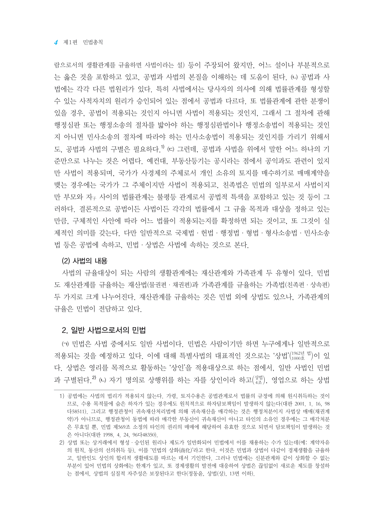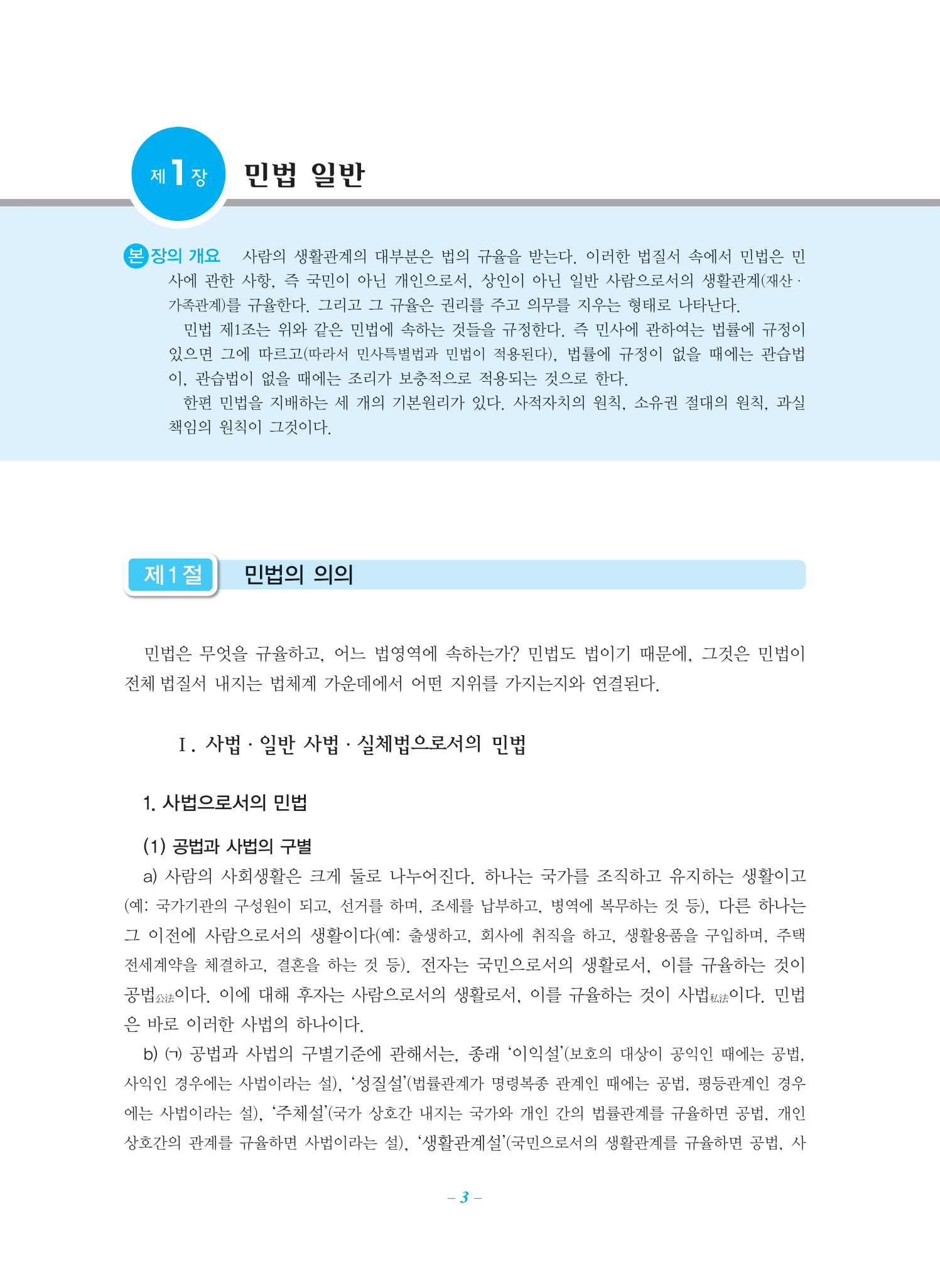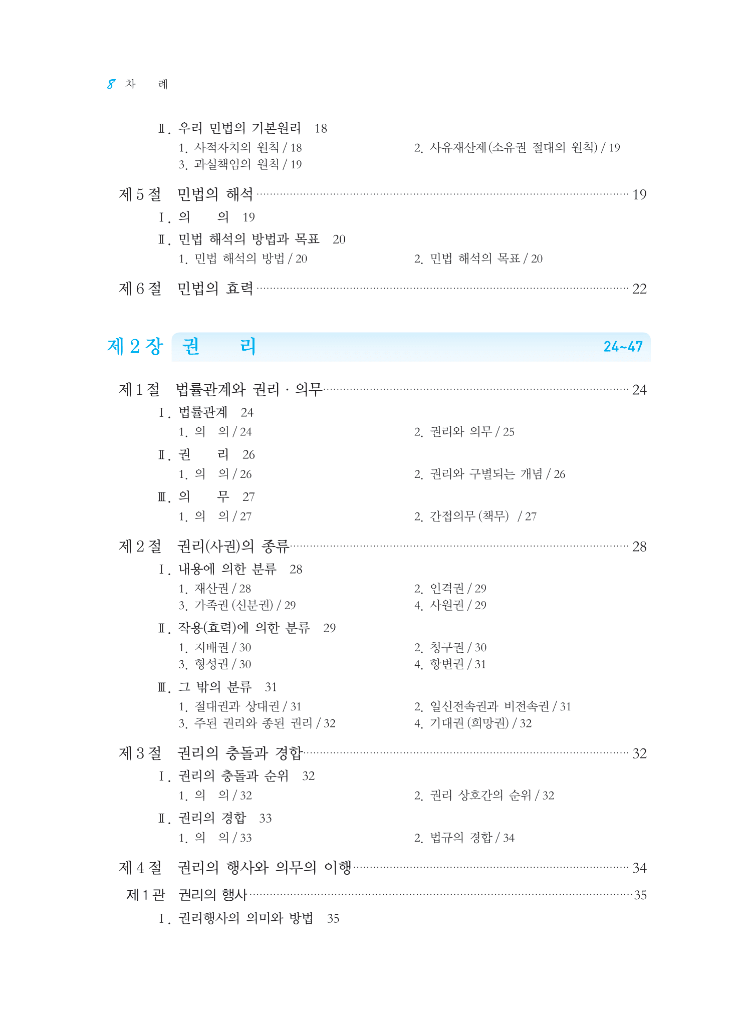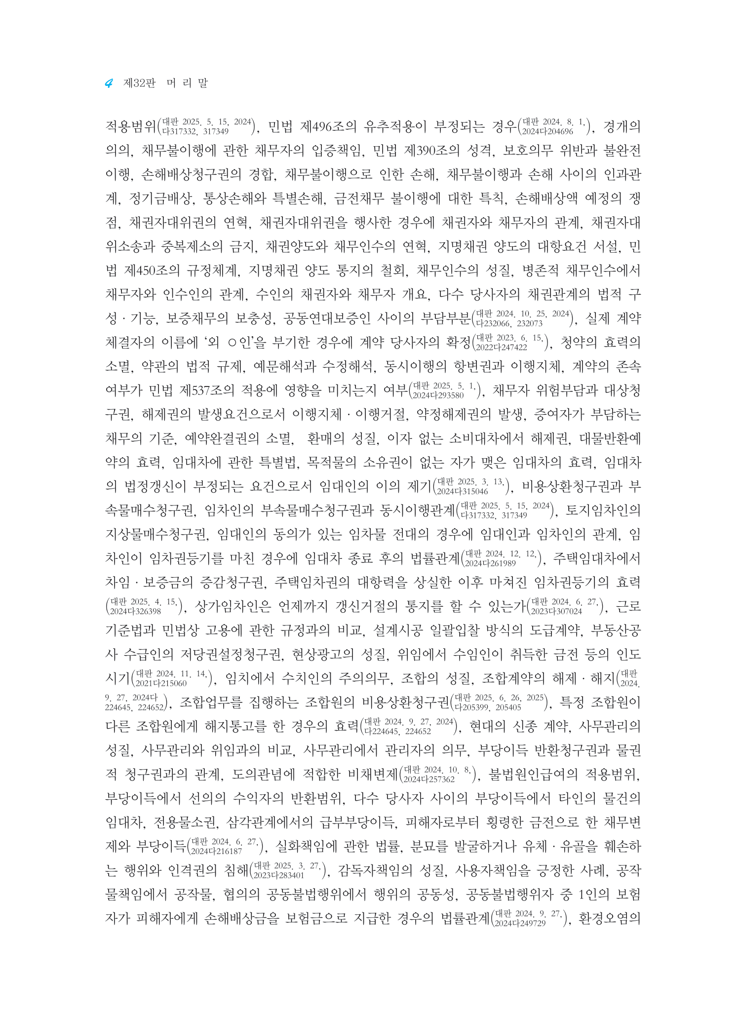 2. 제2편 채권법 채권의 사회적 작용, 채권의 발생, 금종채권, 이자제한법의 적용범위(대판 2024. 11. 14, 2023다272289), 선택채권의 의의, 선택의 소급효, 채권의 소멸원인, 이해관계 없는 제3자의 변제, 특정물 인도채무, 변제충당의 방법, 대물변제의 요건, 공탁의 대상, 상계의 소급효의 적용범위(대판 2025. 5. 15, 2024다317332, 317349), 민법 제496조의 유추적용이 부정되는 경우(대판 2024. 8. 1, 2024다204696), 경개의 의의, 채무불이행에 관한 채무자의 입증책임, 민법 제390조의 성격, 보호의무 위반과 불완전이행, 손해배상청구권의 경합, 채무불이행으로 인한 손해, 채무불이행과 손해 사이의 인과관계, 정기금배상, 통상손해와 특별손해, 금전채무 불이행에 대한 특칙, 손해배상액 예정의 쟁점, 채권자대위권의 연혁, 채권자대위권을 행사한 경우에 채권자와 채무자의 관계, 채권자대위소송과 중복제소의 금지, 채권양도와 채무인수의 연혁, 지명채권 양도의 대항요건 서설, 민법 제450조의 규정체계, 지명채권 양도 통지의 철회, 채무인수의 성질, 병존적 채무인수에서 채무자와 인수인의 관계, 수인의 채권자와 채무자 개요, 다수 당사자의 채권관계의 법적 구성․기능, 보증채무의 보충성, 공동연대보증인 사이의 부담부분(대판 2024. 10. 25, 2024다232066, 232073), 실제 계약체결자의 이름에 ????외 ○인????을 부기한 경우에 계약 당사자의 확정(대판 2023. 6. 15, 2022다247422), 청약의 효력의 소멸, 약관의 법적 규제, 예문해석과 수정해석, 동시이행의 항변권과 이행지체, 계약의 존속 여부가 민법 제537조의 적용에 영향을 미치는지 여부(대판 2025. 5. 1, 2024다293580), 채무자 위험부담과 대상청구권, 해제권의 발생요건으로서 이행지체․이행거절, 약정해제권의 발생, 증여자가 부담하는 채무의 기준, 예약완결권의 소멸, 환매의 성질, 이자 없는 소비대차에서 해제권, 대물반환예약의 효력, 임대차에 관한 특별법, 목적물의 소유권이 없는 자가 맺은 임대차의 효력, 임대차의 법정갱신이 부정되는 요건으로서 임대인의 이의 제기(대판 2025. 3. 13, 2024다315046), 비용상환청구권과 부속물매수청구권, 임차인의 부속물매수청구권과 동시이행관계(대판 2025. 5. 15, 2024다317332, 317349), 토지임차인의 지상물매수청구권, 임대인의 동의가 있는 임차물 전대의 경우에 임대인과 임차인의 관계, 임차인이 임차권등기를 마친 경우에 임대차 종료 후의 법률관계(대판 2024. 12. 12, 2024다261989), 주택임대차에서 차임․보증금의 증감청구권, 주택임차권의 대항력을 상실한 이후 마쳐진 임차권등기의 효력(대판 2025. 4. 15, 2024다326398), 상가임차인은 언제까지 갱신거절의 통지를 할 수 있는가(대판 2024. 6. 27, 2023다307024), 근로기준법과 민법상 고용에 관한 규정과의 비교, 설계시공 일괄입찰 방식의 도급계약, 부동산공사 수급인의 저당권설정청구권, 현상광고의 성질, 위임에서 수임인이 취득한 금전 등의 인도 시기(대판 2024. 11. 14, 2021다215060), 임치에서 수치인의 주의의무, 조합의 성질, 조합계약의 해제․해지(대판 2024. 9. 27, 2024다224645, 224652), 조합업무를 집행하는 조합원의 비용상환청구권(대판 2025. 6. 26, 2025다205399, 205405), 특정 조합원이 다른 조합원에게 해지통고를 한 경우의 효력(대판 2024. 9. 27, 2024다224645, 224652), 현대의 신종 계약, 사무관리의 성질, 사무관리와 위임과의 비교, 사무관리에서 관리자의 의무, 부당이득 반환청구권과 물권적 청구권과의 관계, 도의관념에 적합한 비채변제(대판 2024. 10. 8, 2024다257362), 불법원인급여의 적용범위, 부당이득에서 선의의 수익자의 반환범위, 다수 당사자 사이의 부당이득에서 타인의 물건의 임대차, 전용물소권, 삼각관계에서의 급부부당이득, 피해자로부터 횡령한 금전으로 한 채무변제와 부당이득(대판 2024. 6. 27, 2024다216187), 실화책임에 관한 법률, 분묘를 발굴하거나 유체․유골을 훼손하는 행위와 인격권의 침해(대판 2025. 3. 27, 2023다283401), 감독자책임의 성질, 사용자책임을 긍정한 사례, 공작물책임에서 공작물, 협의의 공동불법행위에서 행위의 공동성, 공동불법행위자 중 1인의 보험자가 피해자에게 손해배상금을 보험금으로 지급한 경우의 법률관계(대판 2024. 9. 27, 2024다249729), 환경오염의 피해에 대한 구제로서 부작위청구, 불법행위에서 손해의 개념, 노동능력 상실률, 위자료청구권의 상속성.