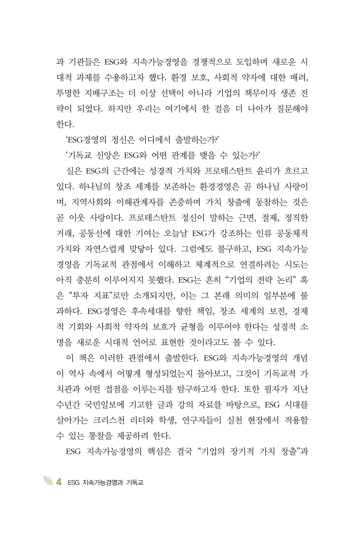 이 책은 이러한 관점에서 출발한다. ESG와 지속가능경영의 개념이 역사 속에서 어떻게 형성되었는지 돌아보고, 그것이 기독교적 가치관과 어떤 접점을 이루는지를 탐구하고자 한다. 또한 필자가 지난 수년간 국민일보에 기고한 글과 강의 자료를 바탕으로, ESG 시대를 살아가는 크리스천 리더와 학생, 연구자들이 실천 현장에서 적용할 수 있는 통찰을 제공하려 한다.