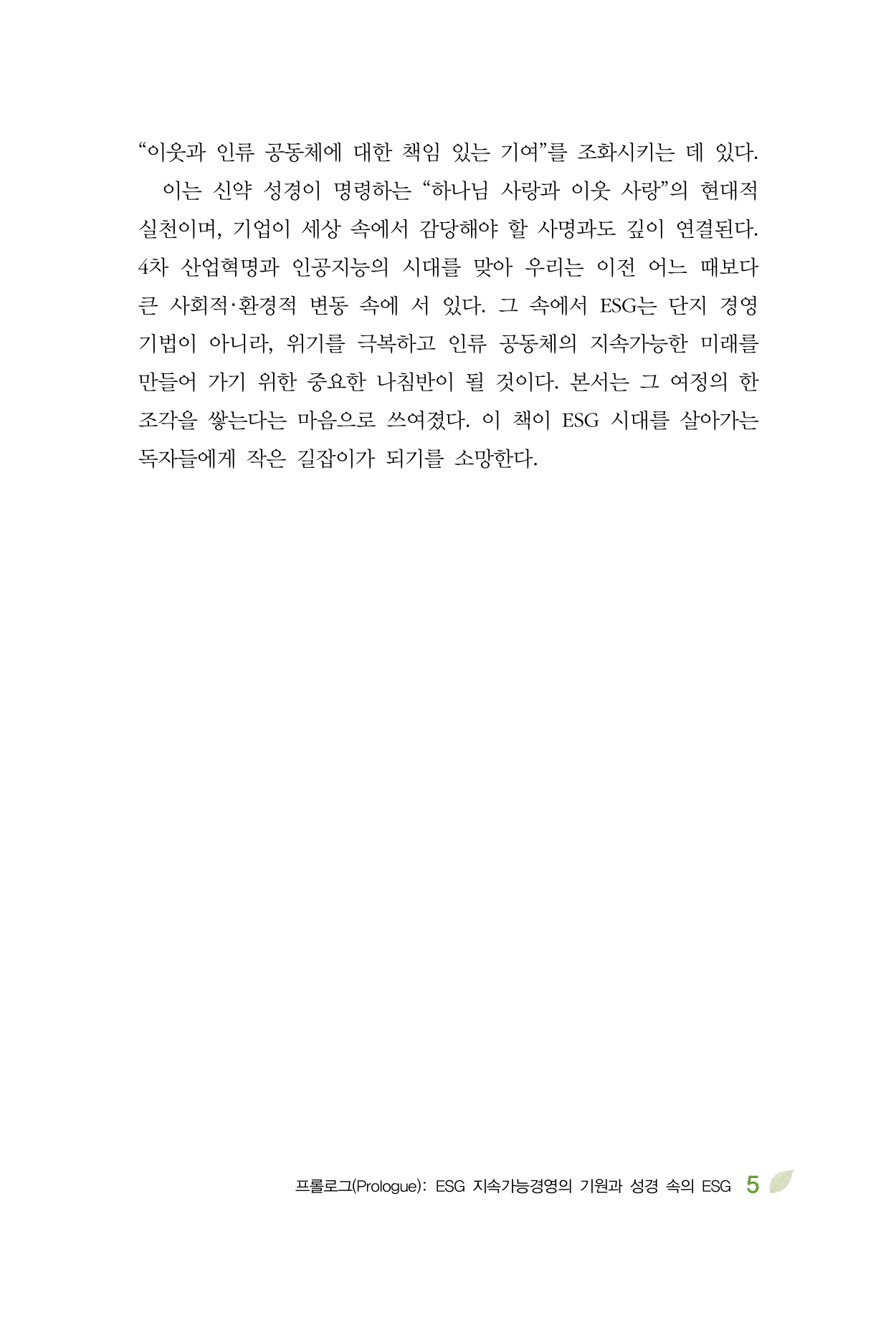 4차 산업혁명과 인공지능의 시대를 맞아 우리는 이전 어느 때보다 큰 사회적・환경적 변동 속에 서 있다. 그 속에서 ESG는 단지 경영기법이 아니라, 위기를 극복하고 인류 공동체의 지속가능한 미래를 만들어 가기 위한 중요한 나침반이 될 것이다. 본서는 그 여정의 한 조각을 쌓는다는 마음으로 쓰여졌다. 이 책이 ESG 시대를 살아가는 독자들에게 작은 길잡이가 되기를 소망한다.