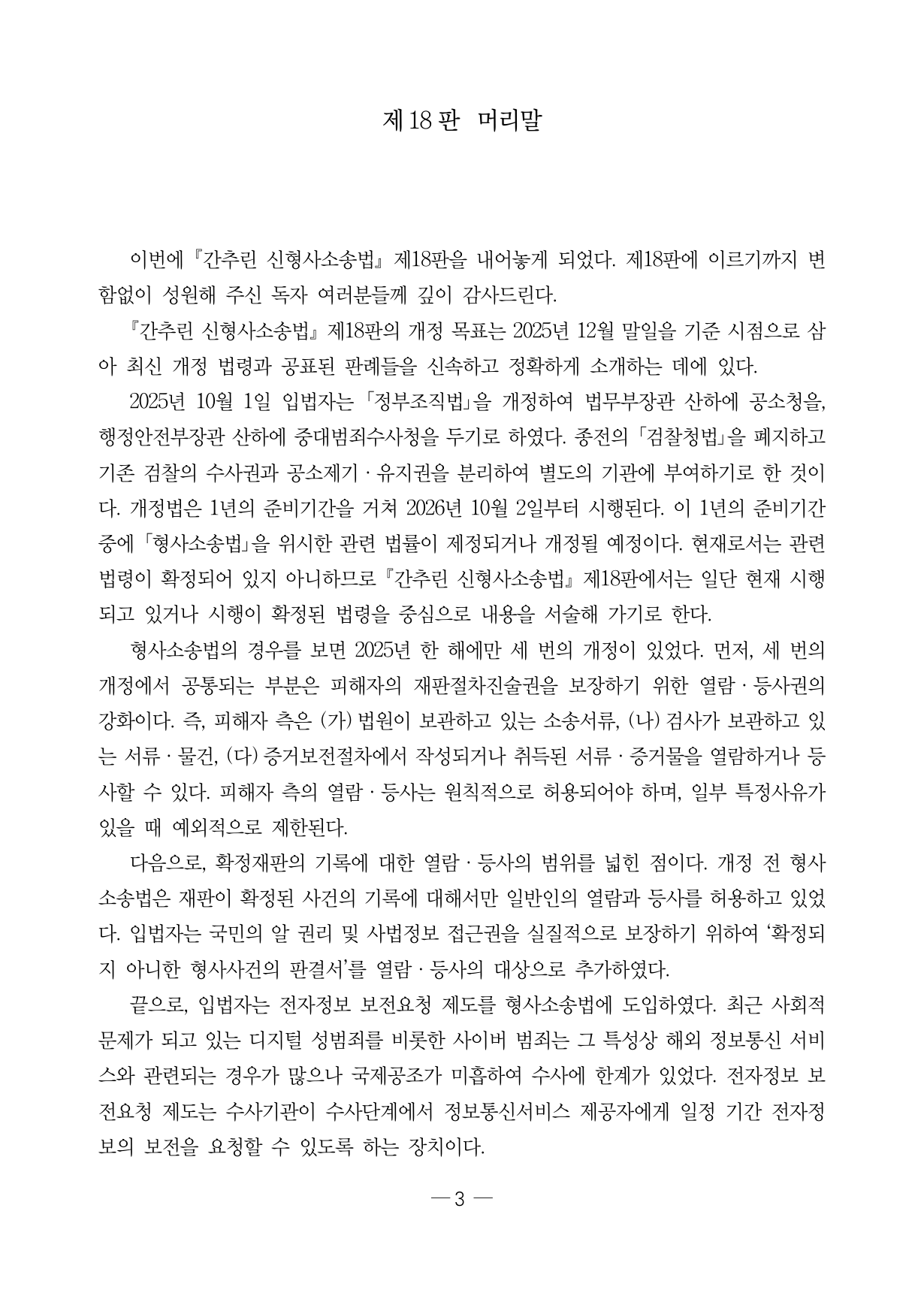 “간추린 신형사소송법” 제18판의 개정 목표는 2025년 12월 말일을 기준 시점으로 삼아 최신 개정 법령과 공표된 판례들을 신속하고 정확하게 소개하는 데에 있다.