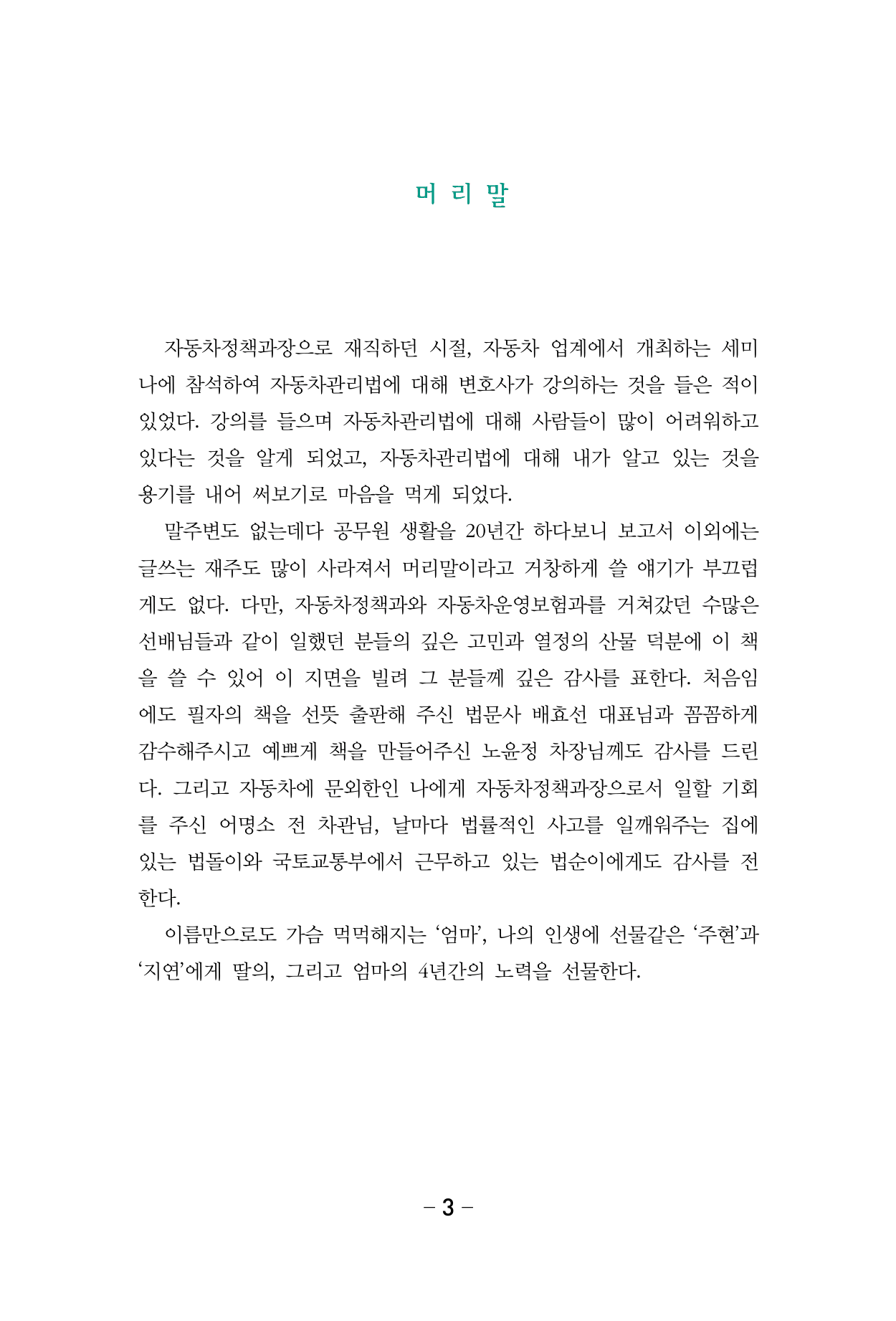 말주변도 없는데다 공무원 생활을 20년간 하다 보니 보고서 이외에는 글쓰는 재주도 많이 사라져서 머리말이라고 거창하게 쓸 얘기가 부끄럽게도 없다. 다만, 자동차정책과와 자동차운영보험과를 거쳐 갔던 수많은 선배님들과 같이 일했던 분들의 깊은 고민과 열정의 산물 덕분에 이 책을 쓸 수 있어 이 지면을 빌려 그 분들께 깊은 감사를 표한다.