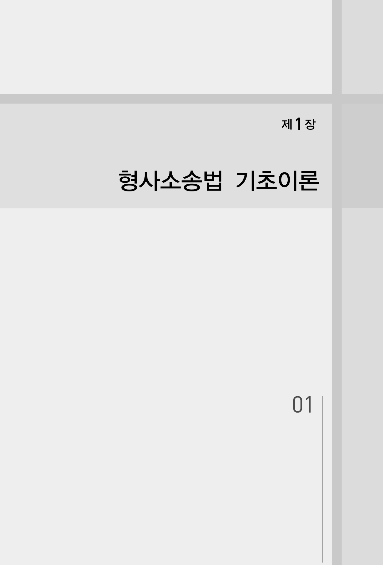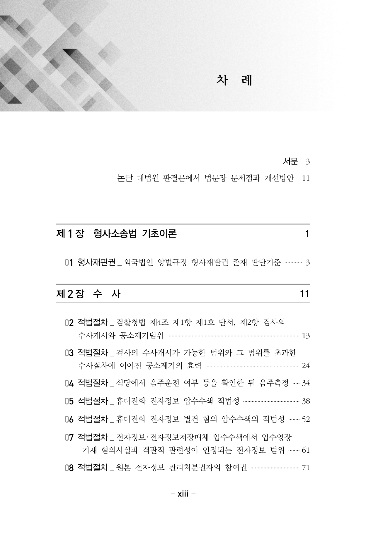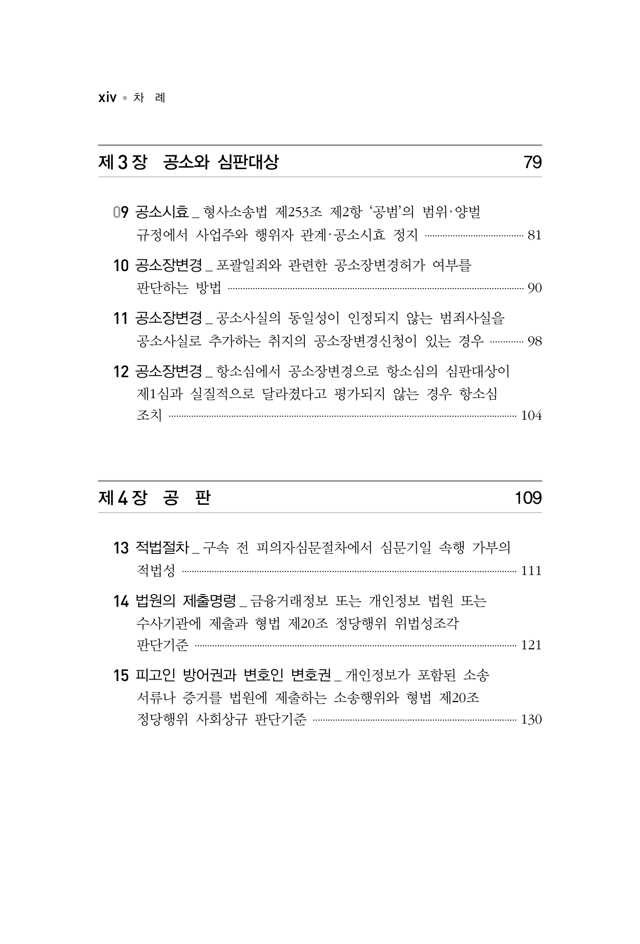 제1장에는 형사소송법 기초이론에 해당하는 3개의 분야를, 제2장에는 수사에 해당하는 8개의 분야를, 제3장에는 공소와 심판대상 3가지 분야, 제4장은 공판, 제5장은 증거에 해당하는 11개의 분야를, 제6장은 재판에 해당하는 8개를 정리하였다.